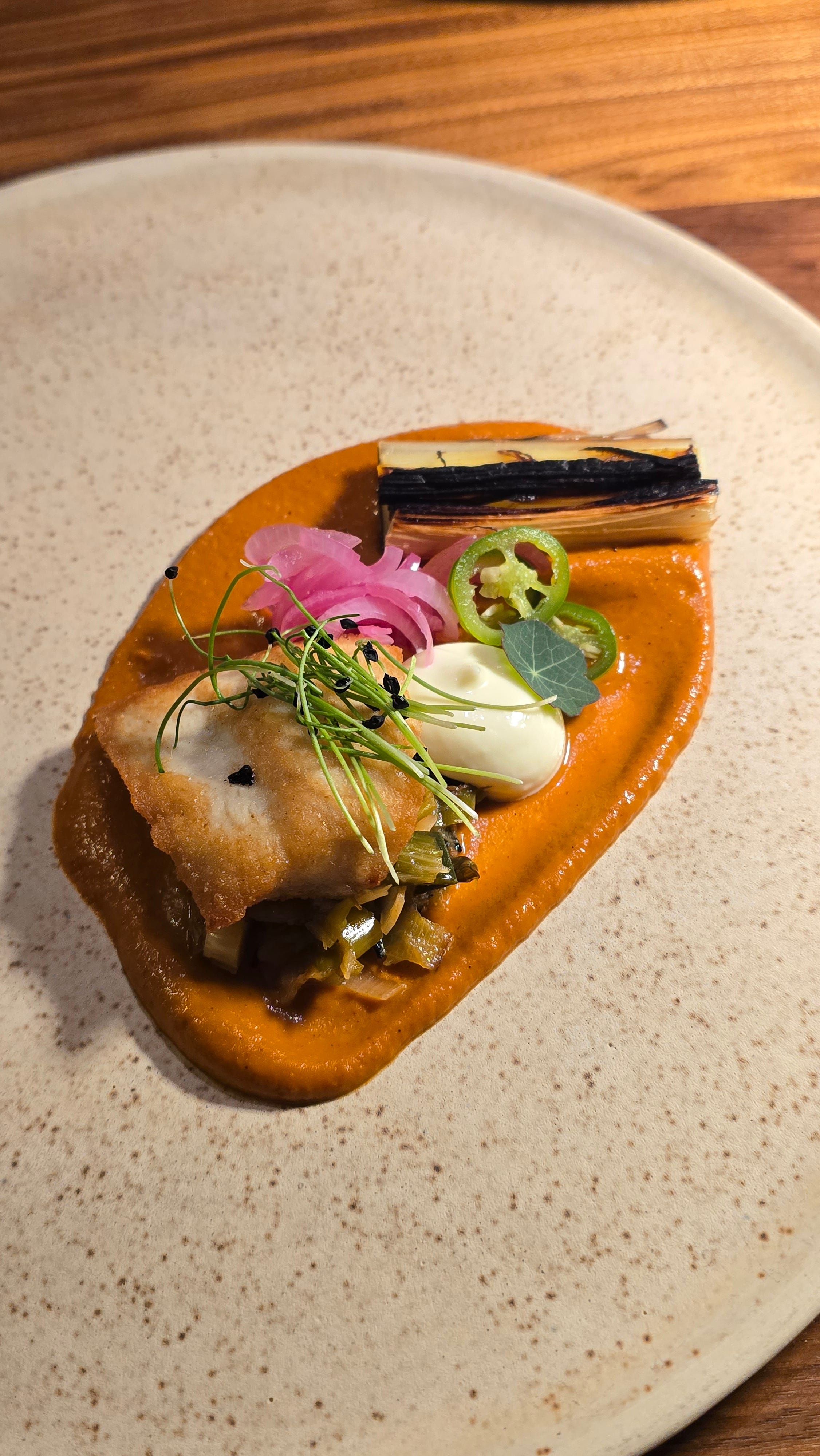 When we are ready to plate we add the fish—a locally sourced sturgeon from Yakima. Alongside it, green leeks, flash-roasted for sweetness and depth. And to finish, a touch of mojo diablo, just enough to bring everything into focus.