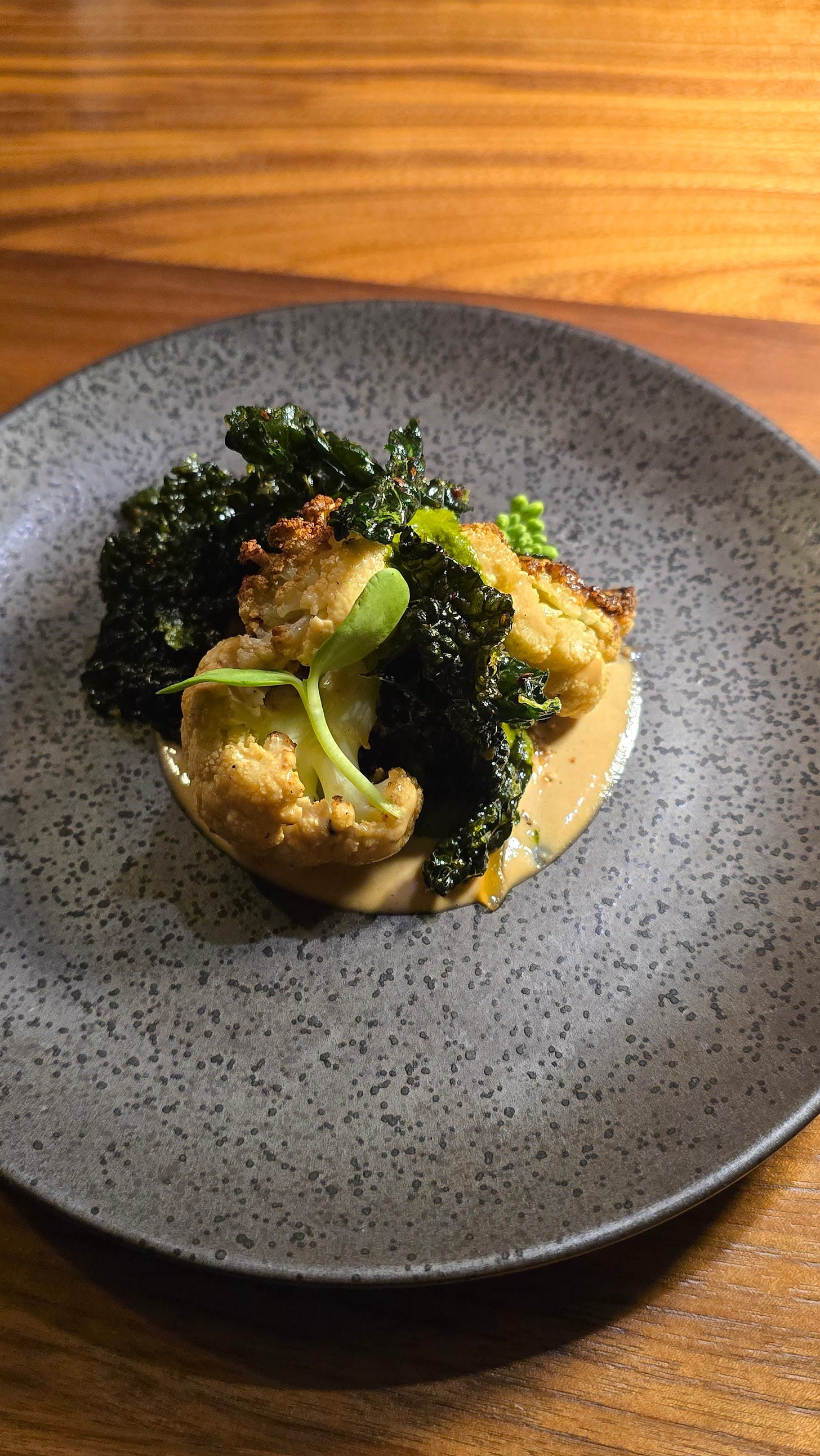 This is a deceptively simple dish for us, because it’s really about honoring the seasons. What you see is straightforward—cauliflower roasted, then finished in the oven right before service to bring out its sweetness and depth.