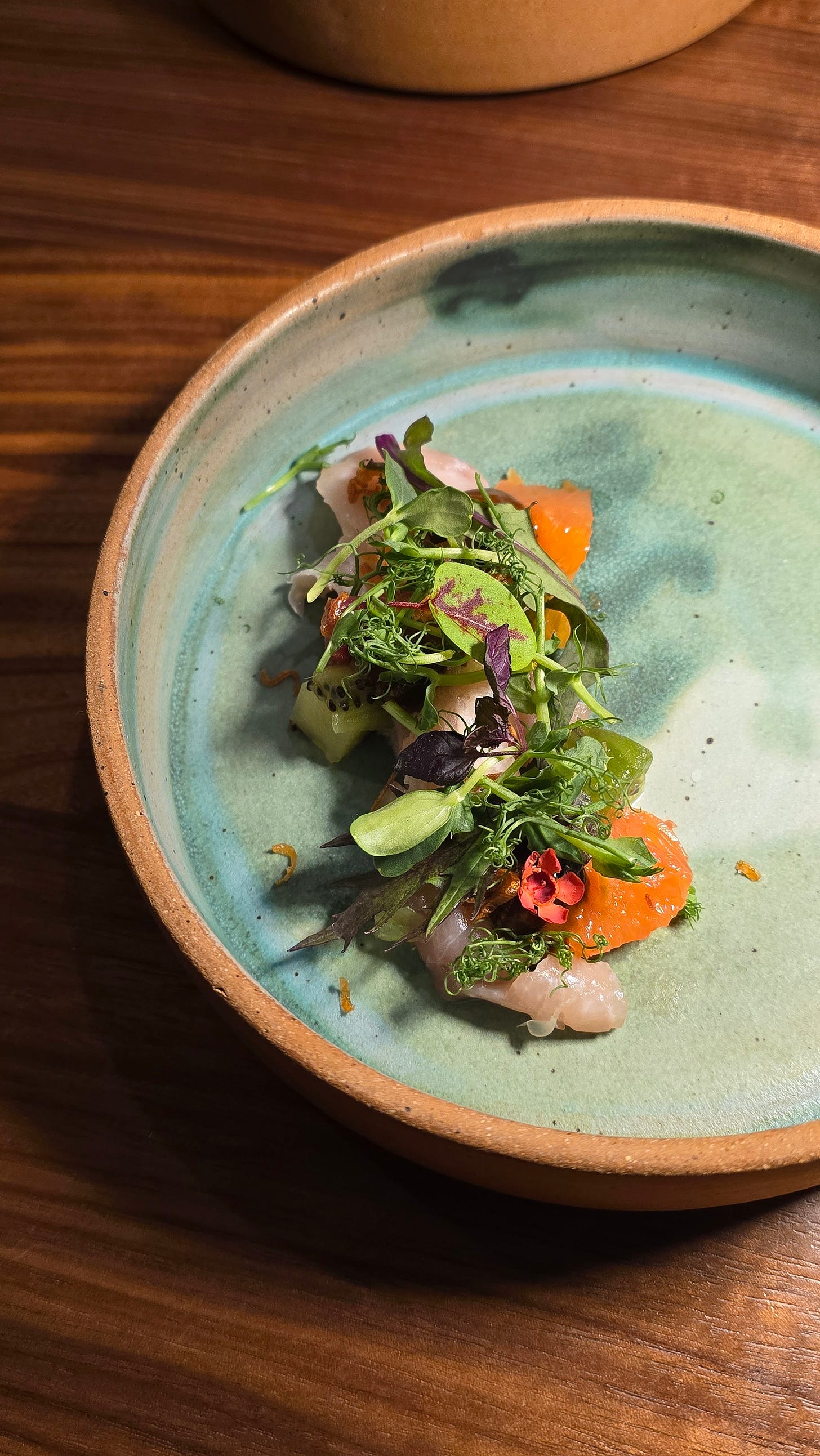 What you have in front of you is a reflection of that dialogue. Hamachi crudo — a nod to Japanese precision — dressed with oranges and kiwis at peak season, fried sunchoke for texture, and greens pulled from our garden.