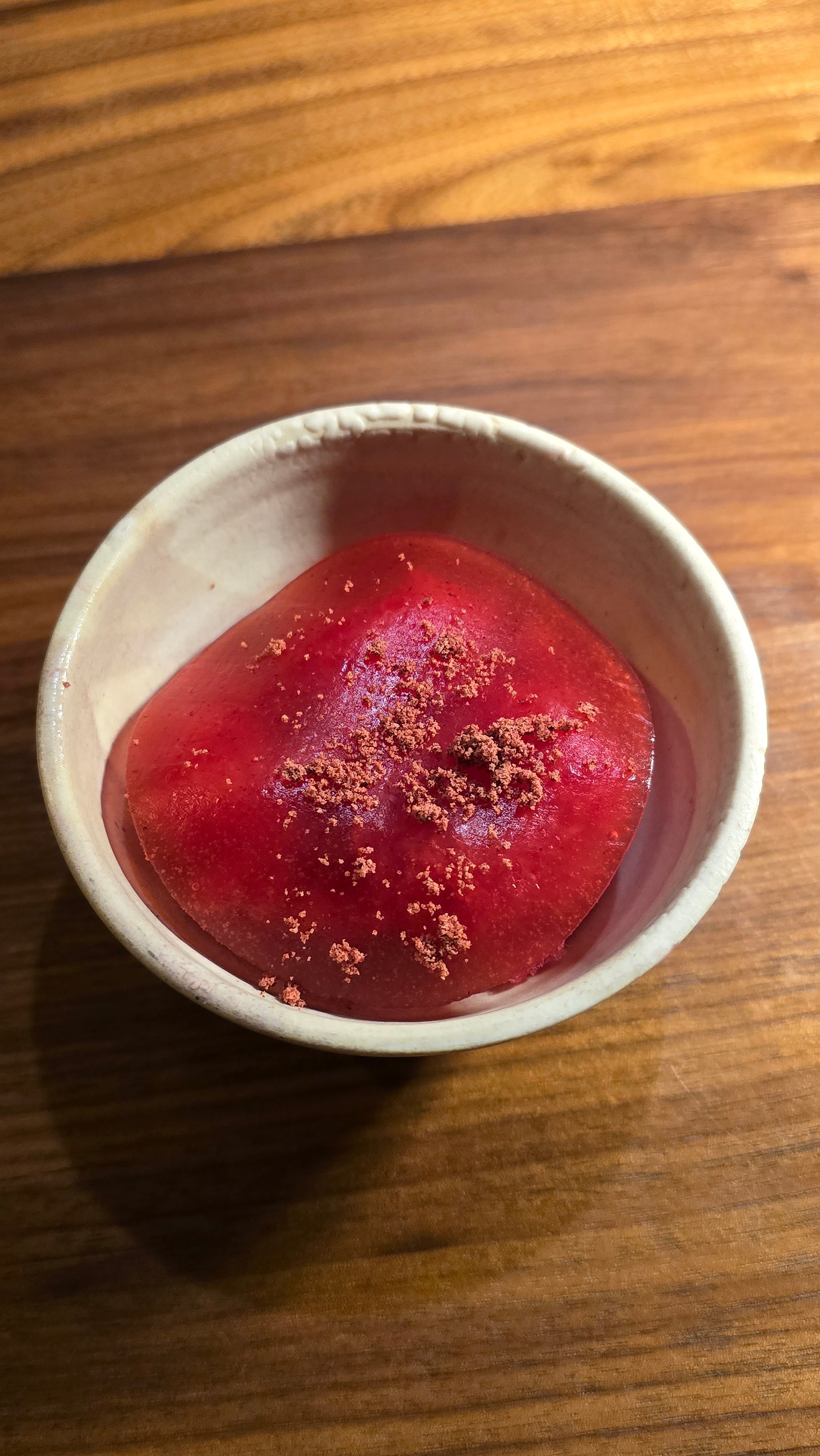 The ice is flavored with hibiscus, giving it that deep crimson color and a gentle tartness. Beneath it is a sumo mandarin and lemon curd, adding a little richness and citrus brightness.
