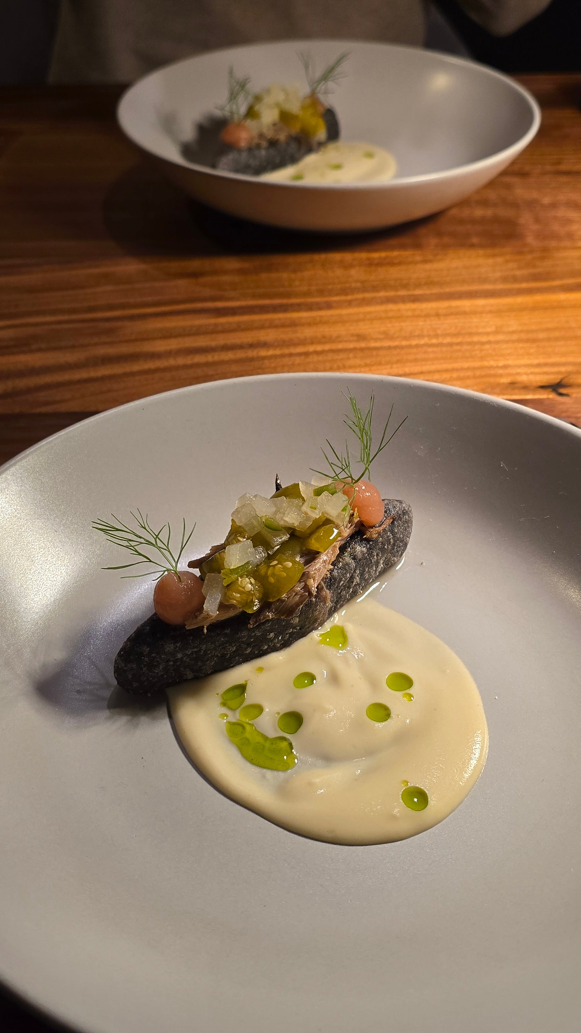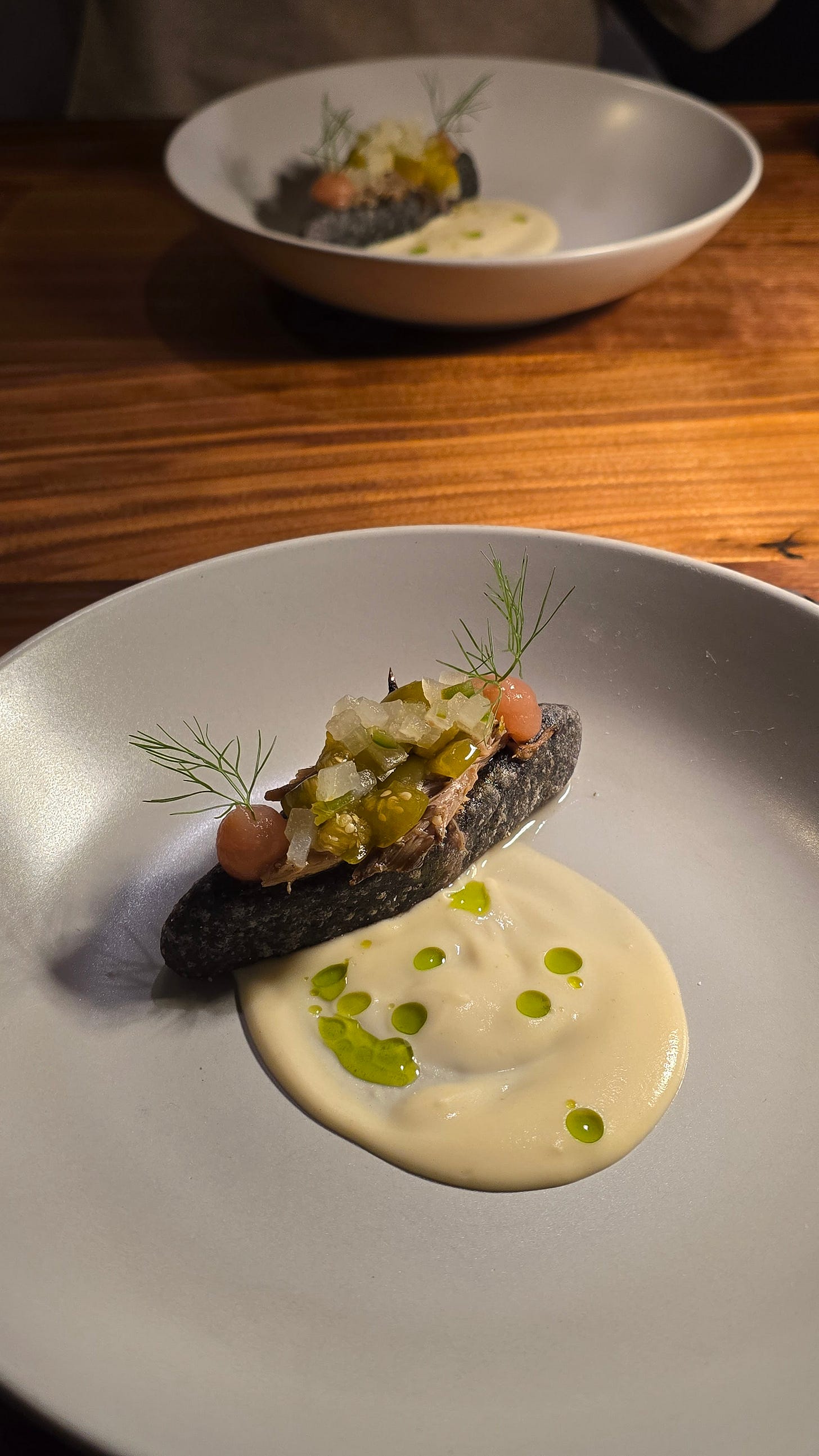 What transforms it is the sauce. Not quite a mole, but built with the same intention. It’s a green sauce composed of mostly brassica and olive oil, lemon juice and zest, a touch of mostarda, salt, and pepper. Clean. Bright. Purposeful.