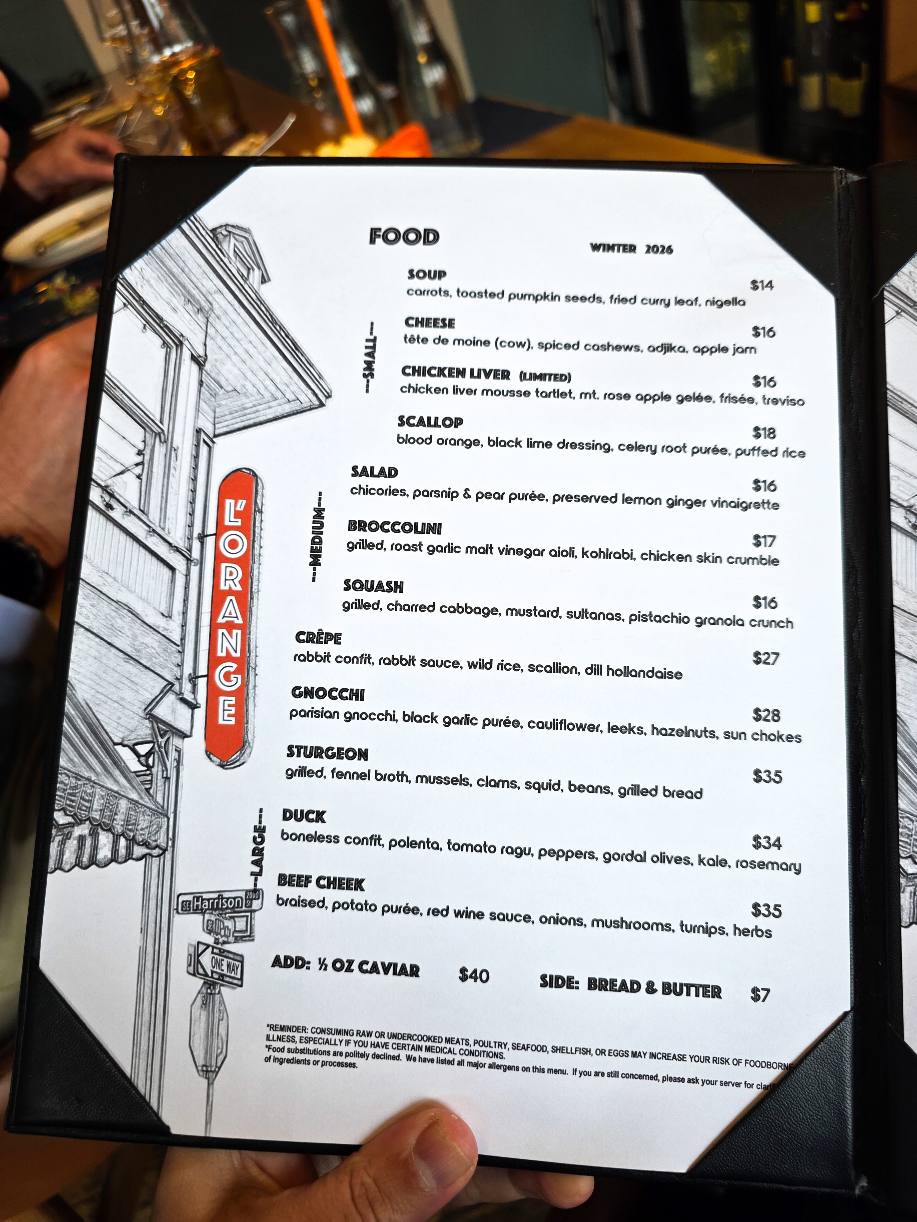 I sat down, opened the menu, and looked for the thing I always look for first. The language of the seasons. What’s alive right now. What the kitchen is paying attention to. Chicken liver. Beef cheek. Duck. Carrot soup. Chicory salad. Broccolini. Squash.